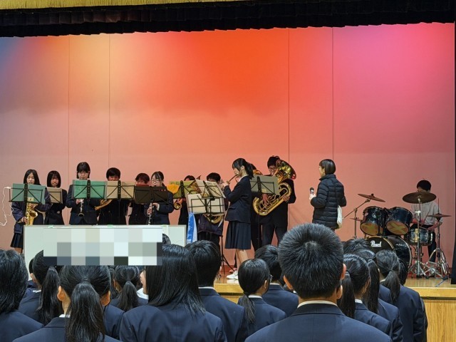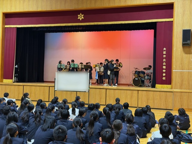 Keywords: Year 1 grade assembly, brass band, welcome song, full-group rehearsal, event preparation, Hokuryo Junior High School