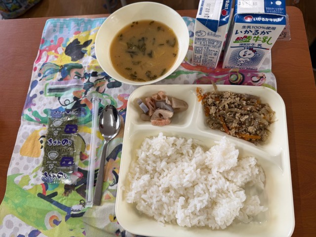 Today’s chicken-and-burdock rice was a mix-at-the-table style: add the individually packed shredded nori and stir just before eating.
