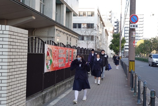 This morning, our teachers—mainly those in charge of the third-year grade—stood at Minami-Morimachi Station and Sakuranomiya Station to encourage our third-year students on their way to the exam venues.