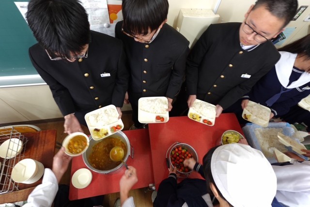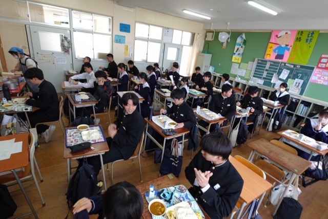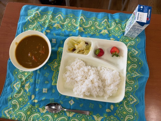 チキンカレーライスは安定のおいしさで、教室のあちこちから「おかわりしたい!」という声が聞こえてきそうな人気ぶりでした。金時豆と野菜のサラダは、豆が少し苦手という生徒もいたようですが、野菜と一緒に食べると意外といけると気づいた生徒もいた様子でした。デザートのいちごが食卓に春の気配を添えていました。