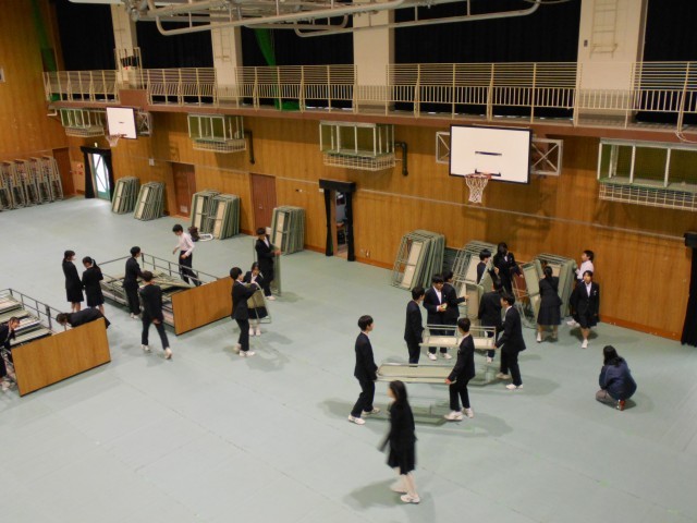 本日、1年生は体育館にて卒業式会場の仮設営を行いました。まもなく迎える卒業式に向けて、式典当日の会場の配置などを確認するための大切な準備です。