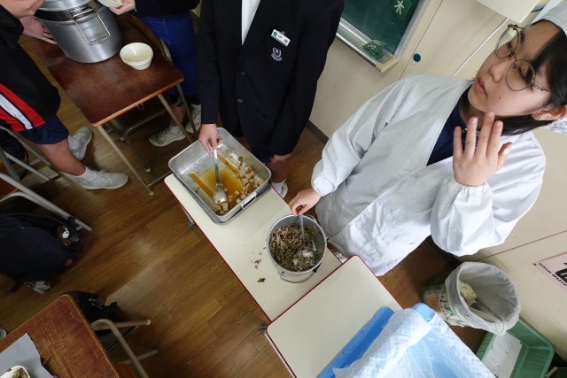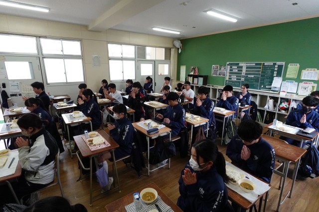 配膳の様子を見ると、給食当番の生徒が白衣を着てテキパキと盛り付けを進めていました。クラス全員が手を合わせて「いただきます」をする姿もしっかり見られました。