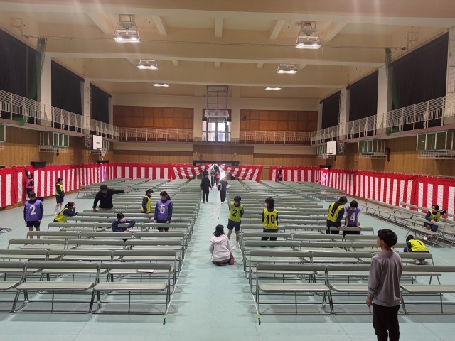 Wearing numbered bibs, the students lined up rows of benches with care, hung red-and-white curtains, and arranged the area around the stage. Their teamwork was impressive — true Hokuryo senpai spirit. In fact, they finished a full 30 minutes ahead of schedule.