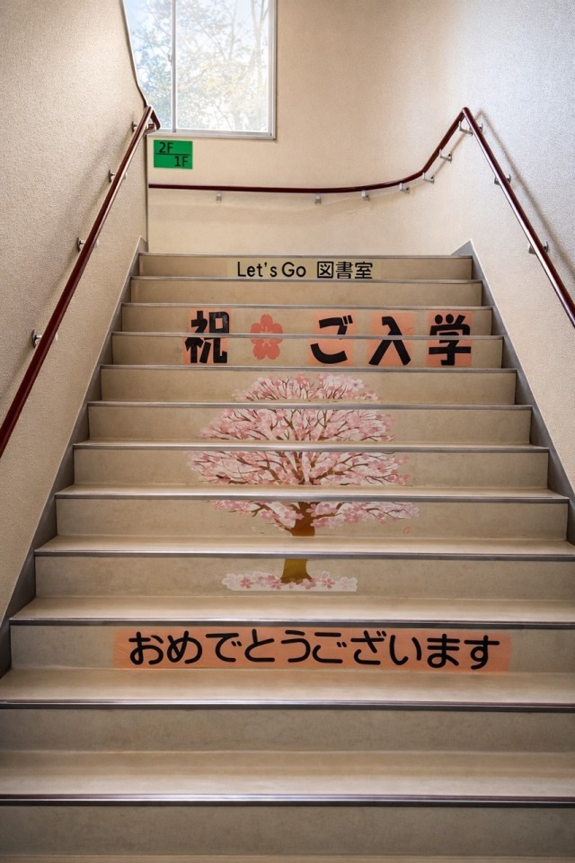 On the staircase leading up to the classrooms, volunteers from the school's "Genki Up" program created a beautiful piece of staircase art. A cherry blossom tree in full bloom stretches across the steps, accompanied by the message "Congratulations on Your Enrollment." It is ready to welcome every new student who climbs those stairs tomorrow morning.