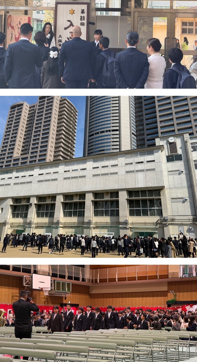 正門前の看板の前では、真新しい制服に身を包んだ新入生と保護者の方々が記念撮影をする姿があちこちで見られました。今年度から靴下やスニーカーの色の指定がなくなり、足元にはさまざまな色が並んでいました。一人ひとりの個性がのぞく、新鮮で気持ちのよい光景でした。