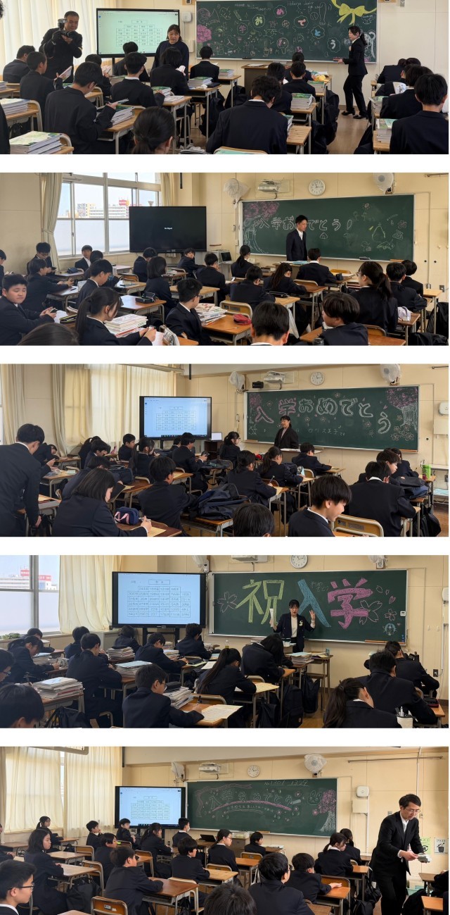 式後、新入生は各教室へ移動し、担任の先生と初めての顔合わせ。黒板には「入学おめでとう!」のメッセージが描かれ、生徒手帳を受け取ったり、新しい教科書に名前を書いたりと、中学校生活の第一歩を踏み出しました。