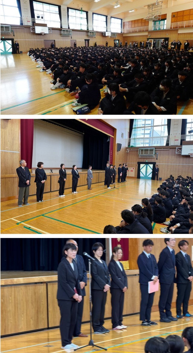开学典礼前,学校首先举行了新教职员工的就任仪式。今年共有14位新教职员工加入北稜中学校,由新任教导主任代表致辞。体育馆里,同学们端正地坐在地板上,认真聆听新老师们的问候。