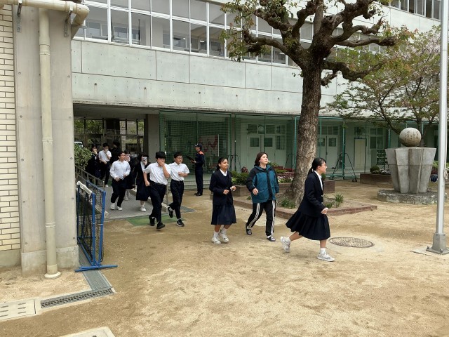 On Monday, April 13, Hokuryō Junior High School conducted its first fire evacuation drill of the academic year during the sixth period. Firefighters from the Yoriki Branch of the Osaka City Kita Fire Station joined us on campus to provide professional guidance.
