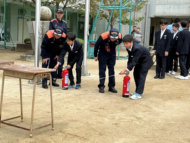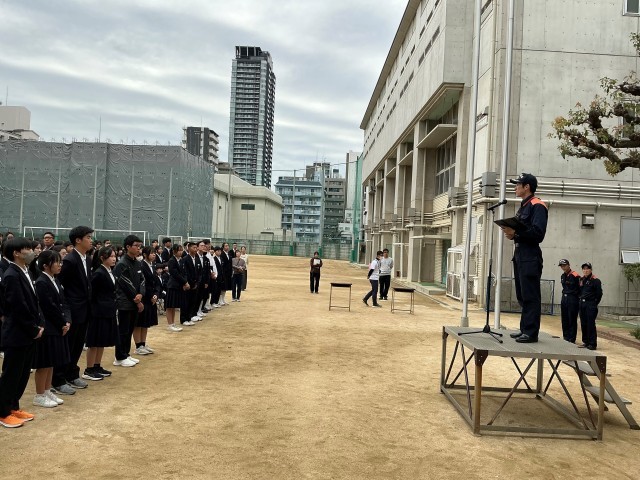 4月13日(星期一)第六节课,本校开展了本年度首次火灾避难训练。大阪市北消防署与力出张所的消防队员亲临现场,为同学们进行了专业指导。