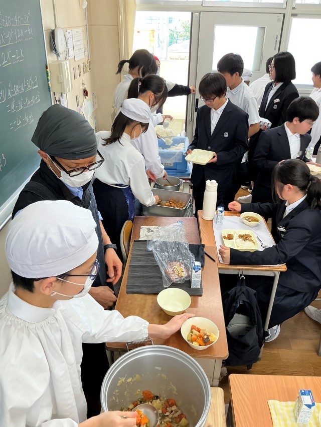 二年一班的同学们齐心协力地进行配餐。大家全员到齐后双手合十说「我开始吃了」的样子令人印象深刻,在沉稳的气氛中开始了用餐时间。