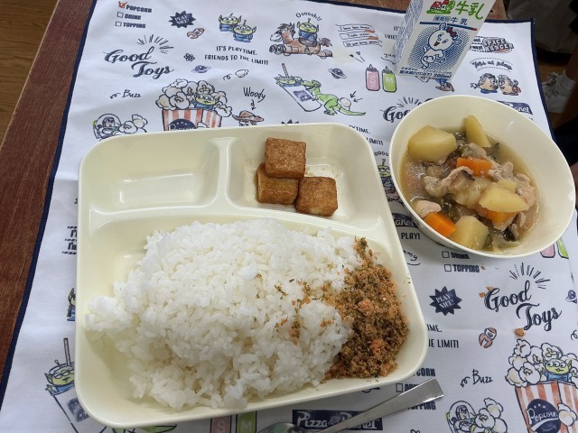 关键词:北稜中学、营养午餐、学校日记、鸡肉土豆炖菜、厚炸豆腐、红鲑鱼肉松、和食、二年级