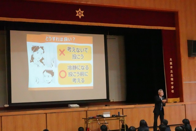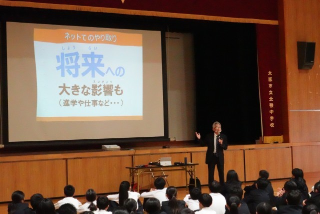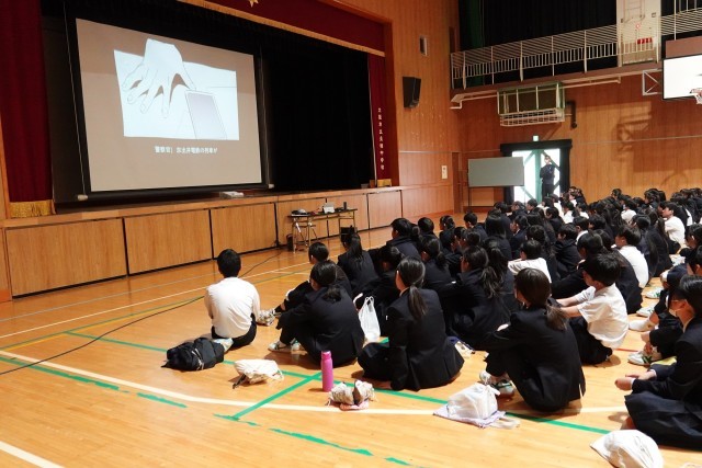 講演では、インターネット上での軽率な書き込みや画像の投稿が思わぬトラブルにつながることや、場合によっては損害賠償などの重大な問題に発展する可能性があることについて具体的に説明がありました。また、SNSの使い方が原因で人間関係が悪化・破綻してしまうケースについても紹介され、生徒たちは身近な問題として真剣に考え、周りと話し合う様子が見られました。