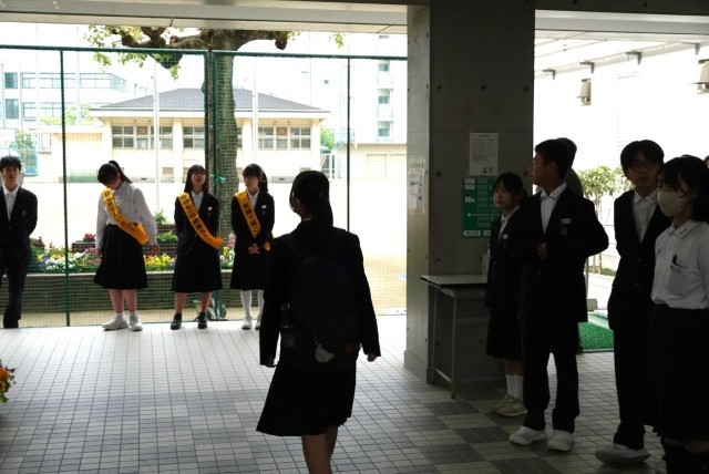 朝は突然の大雨に見舞われましたが、生徒たちの登校時間にはすっかり雨も上がり、さわやかな風が吹く一日のスタートとなりました。正門付近では、生徒会執行部生活委員のメンバーが黄色いたすきを掛けて元気なあいさつ運動。登校してくる仲間に「おはようございます!」と声をかける姿が印象的でした。