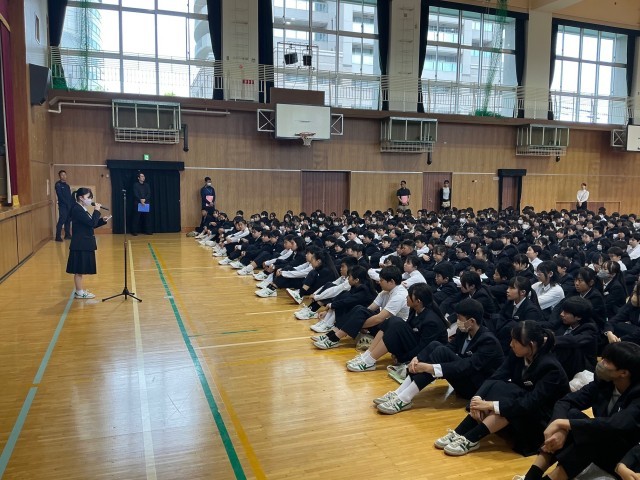 毎週火曜日は全校集会の日です。体育館に全校生徒が集まり、まずは校長講話が行われました。