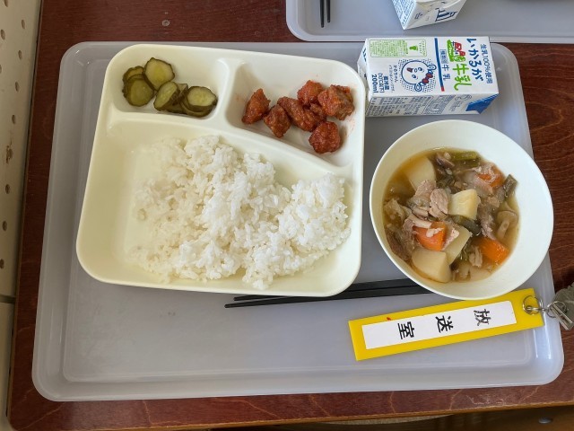 キーワード:北稜中学校、給食、学校日記、まぐろのオーロラ煮、豚肉と野菜の煮もの、生徒会執行部、お昼の放送、4月