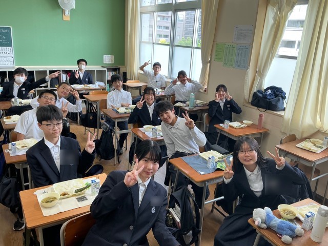 今日おじゃましたのは2年4組。4限目が体育だったにもかかわらず、相変わらずの爆速で配膳を完了していました。「学校一配膳が速い」クラスの面目躍如です。速く配膳できた記念に、みんなでピースサインをしながら元気よく「いただきます!」をしていました。