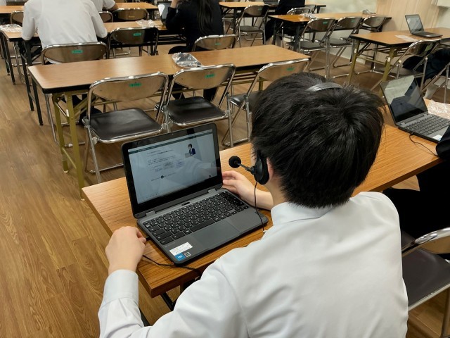会場となった多目的室では、生徒たちが真剣な表情で指示に従いながら調査に取り組んでいました。イヤホンマイクに向かって一人ひとりが自分の言葉で英語を発する姿には、日頃の学習の積み重ねがうかがえました。