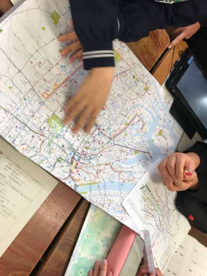 市内の路線地図やパンフレット、タブレット端末を使って、地下鉄での市内見学オリエンテーリングの計画を立てました。