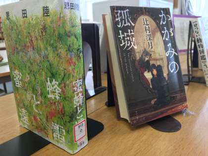 直木賞受賞作の恩田陸著『蜂蜜と遠雷』、本屋大賞受賞作の辻村深月著『かがみの孤城』。恩田陸さんは『六番目の小夜子』や『夜のピクニック』、『メイズ』など、辻村深月さんは『本日は大安なり』や『サクラ咲く』などを書かれている著者ですね。