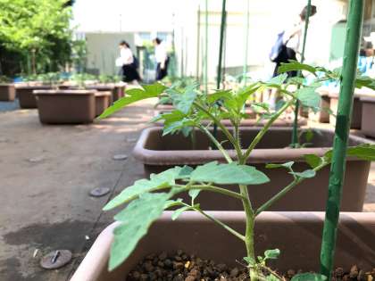 2年生は校外学習に行く前に、みんなトマトの水やりに、行ってます。みんな順調に育っています。夏が楽しみですね。
