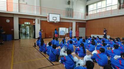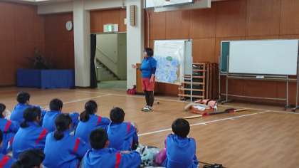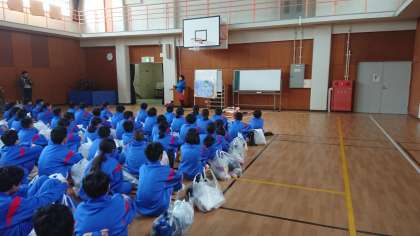 入館式の様子です。施設の方へのご挨拶の後、職員の方から施設利用方法と午後の活動についての説明がありました。