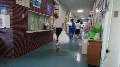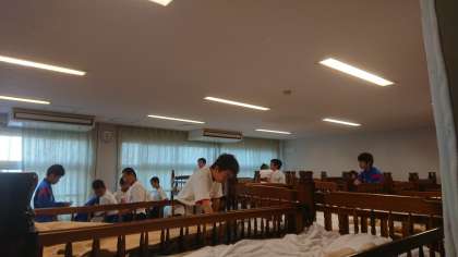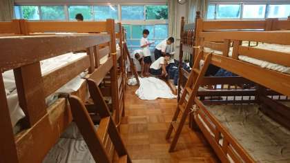 起床(6時)の様子です。寝具の後片付けがたいへんです。みんな元気かな?6時40分から朝のつどいがあります。