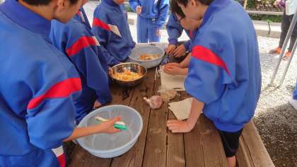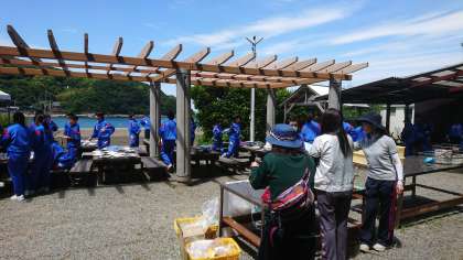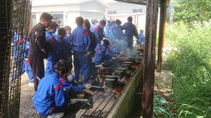 かまど係は、たいへんです。「煙たすぎる」「ゴーグルなしでは無理」の声が。