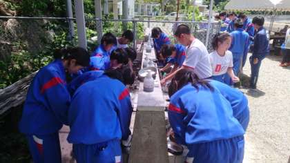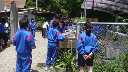 野外料理もそろそろ後片付けの時間となりました。「生徒の皆さん、しっかりみがきましょう!」「来たときよりも美しく!」
