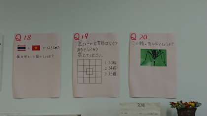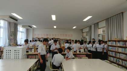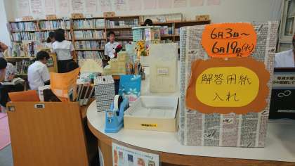 学校元気アップ支援事業(図書館支援)の取組として、6月3日〜19日の間、図書館で昼休みにクイズ大会(壁に貼られているクイズに、本で調べながら答えていく方式です)が行われています。今日は、多くの生徒が参加してくれています。(1年生が多いかな)「みなさん、どんどん図書館にきて解答用紙に答えを書いて出してくださいね。何か良いことがあるかもよ!」