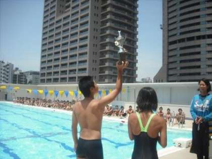 競技が始まると、全力で泳ぐ生徒、仲間を応援する生徒、係りの活動をする生徒が一体となって水泳大会を盛り上げます。