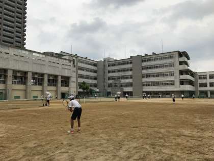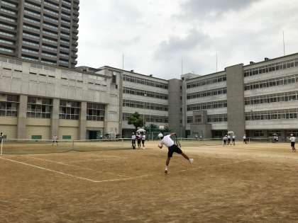 本日午前、男子テニス部では2年生と3年生対抗の校内戦を行っています。