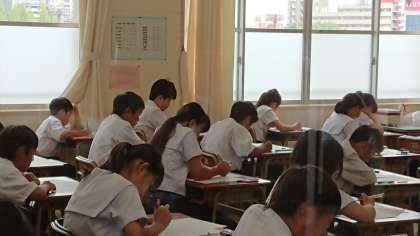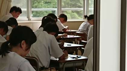 2学期の始業式が昨日行われたばかりですが、本日は、全学年で『実力テスト』が実施されています。夏休みから一転、子どもたちは「現実に引きずり込まれた気分かな?」「頑張れ、北稜中学生!」