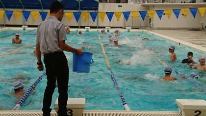 男子の『碁石拾い』の様子です!天候の悪い中、子どもたち頑張っています。違うクラスのところにせっかく拾ってきた碁石を置いている人も!担任が怒ってます。“ぷんぷん”
