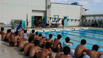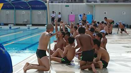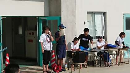 閉会式の様子です。優勝の1年1組は、大喜びでした。敗れたクラスも悔いはなく、あたたかい拍手が送りました。担当の先生からも「とても気持ちの良い、さわやかな気分にさせてくれた素晴らしい水泳大会でした」とのお話がありました。