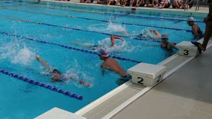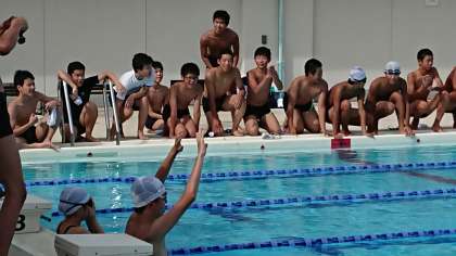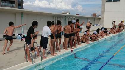 最終種目の男女混合リレーは、おおいに盛り上がりました!「3年生の皆さん、中学校最後の水泳大会は、どうでしたか?」「頑張れましたか?」