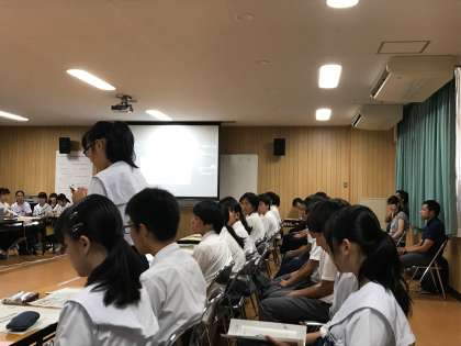 多目的室いっぱいの生徒や先生たちの前で立派に発表できましたね。素晴らしいです。