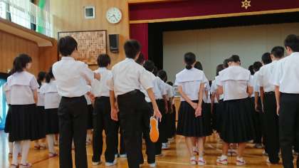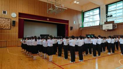 今朝は、1年生の学年集会がありました。担任の先生からは、先週に行われた体育大会についてのお話がありました。「1年生には、本気で頑張って応援している姿があった」「仲間を応援し励まし合うことは、勝ち負け以上に大切なことだと先生は思っている」「また、選手決定の時から、休んでいる人のことも考えることができており、仲間への気配りや、目配りができていることも嬉しく感じた」との内容でした。1年生の学年のまとまりは、最高でした!「おつかれさま〜」