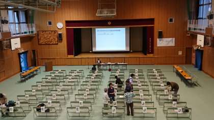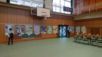 明日の中間テスト終了後『全市研究発表会(美術)』が、本校を会場に開催されます!宮田教諭の『研究授業』後に、体育館において『実践報告』や『パネルトーク』が行われるなど、全市の美術関係の先生方が一堂に会します。写真は、前日準備の様子です!「宮田先生、がんばれ〜」「2年2組の生徒の皆さんも、一生懸命の姿を全市の先生方に観てもらってください」