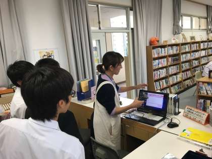 写真は、図書委員会の様子で、図書館補助員の方から、貸し出しシステムの操作法を説明していただいてるところです。
