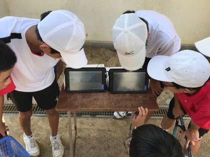 タブレット端末の「ラグミラー」というアプリケーションソフトウェアを使い、自分のフォームをチェックしています。