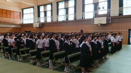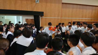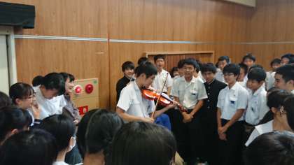 芸術鑑賞会の休憩の合間にバイオリンを弾く男子生徒が2名もあらわれました。「すげえ〜」「かっこい〜」