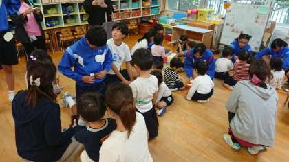 本日、2・3限目の家庭科の授業(3年3組)で、『ふれあい体験学習(保育実習)』を行いました。生徒たちは、自作のおもちゃを持参して園児(滝川幼稚園)たちと楽しく遊んで(遊ばれて)いました!みんな優しいお兄ちゃん・お姉ちゃんで園児も大喜びでした。