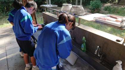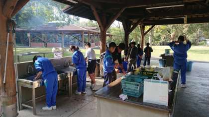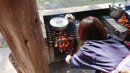 野外炊飯のようすです。先生も必死です。「火を消すな!」