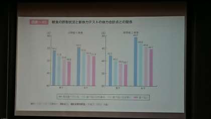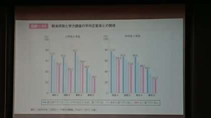 それらのデータには、『全国学力テストや体力テストと朝食との関係について』の調査結果があり、明らかに朝食をとっている人の方が高い数値となっていること分かりました。