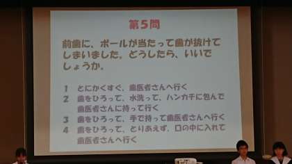 本日6限目に1年生を対象に『歯と口の健康教室』が開催されました。はじめに保健委員会が中心となり『歯と口のクイズ』があり、意外な答えに驚きの声があがる場面も。