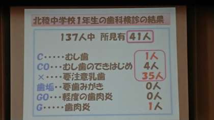 谷口先生からは、北稜中学校の歯科検診の結果(むし歯は少なかったようですが・・・)や、「どうしてむし歯になるのか」というお話を図や写真で詳しく分かりやすく説明していただきました。