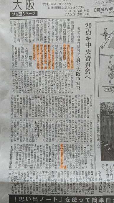 本校2年生大濱遼介くんの読書感想文が大阪市の審査の結果、入賞・入選作品となりました。大阪市は、入賞作品から10点を中央審査会に送り、来年の1月の最終審査で全国コンクールの入賞作品が決定します。写真は、本日の毎日新聞朝刊の記事です。「大濱くん、おめでとう!」