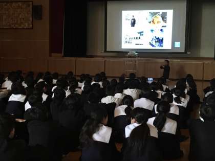 1年生は、体育館で1月に取り組むフィールドワーク(地域探訪)の説明を聞きました。