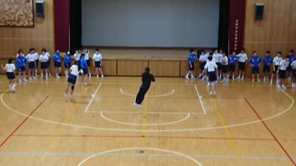 2年3組のダンスの様子です。講師先生は、すごい運動能力です。空中で脚を斜めにしてもバランスは崩れません。すごいです。