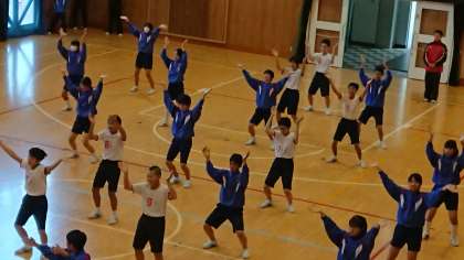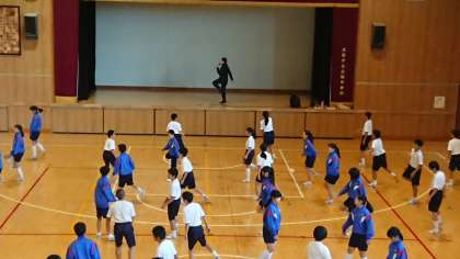 1年生は、初めてのダンスの授業です。まずは、リズムを徹底的に楽しく習得!ダンスの基本をしっかり学んでいます。「がんばれ1年生」「2・3年生に追いつけ、追い越せ!」